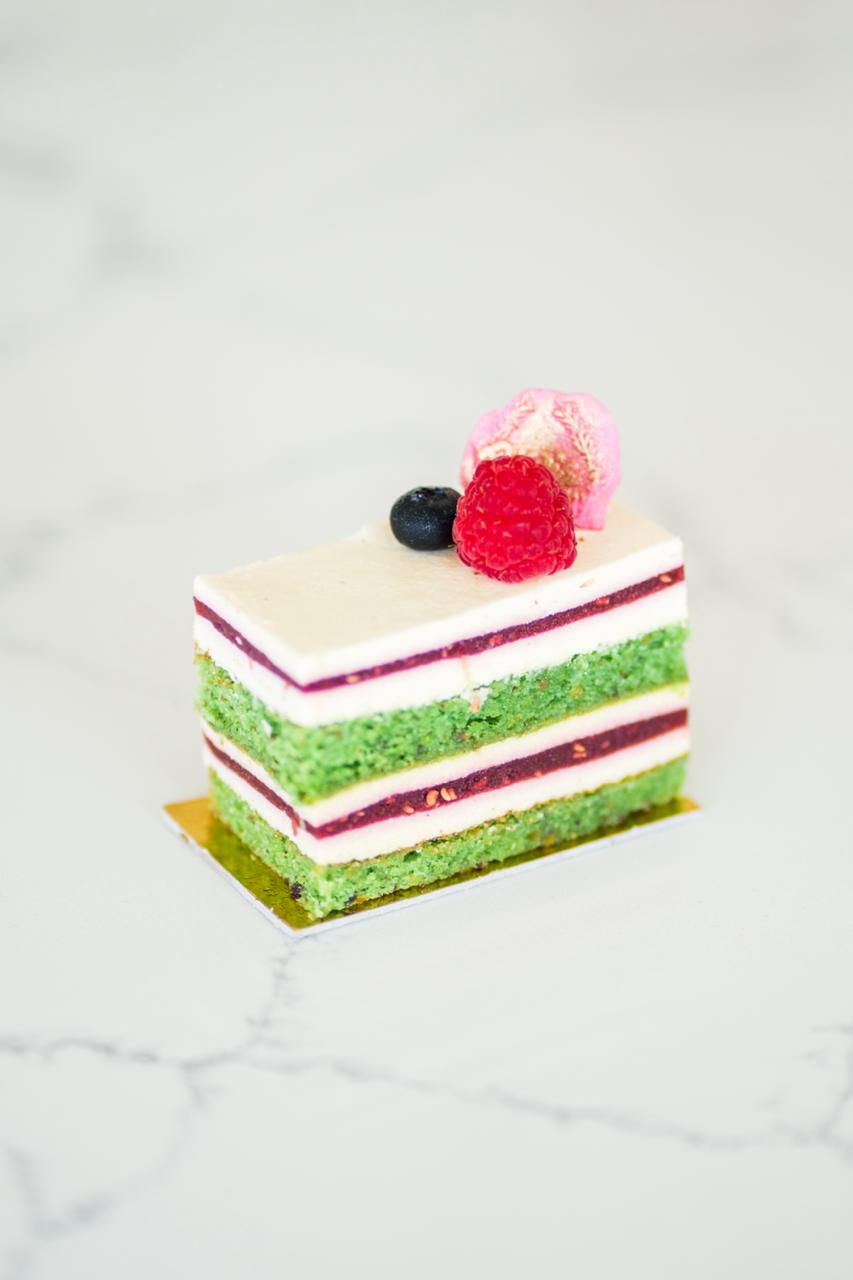 Joconda de pistachos con jalea de frambuesa y crema Bavaria de vainilla natural.