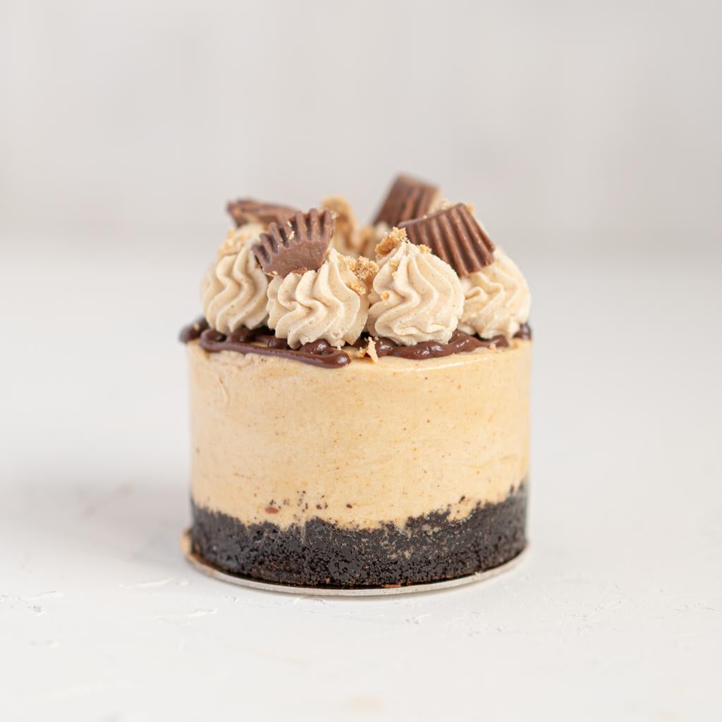 Un cremoso cheesecake de mantequilla de maní, relleno con trocitos de chocolate Reese’s, con ganache de chocolate y crema de mantequilla de maní.